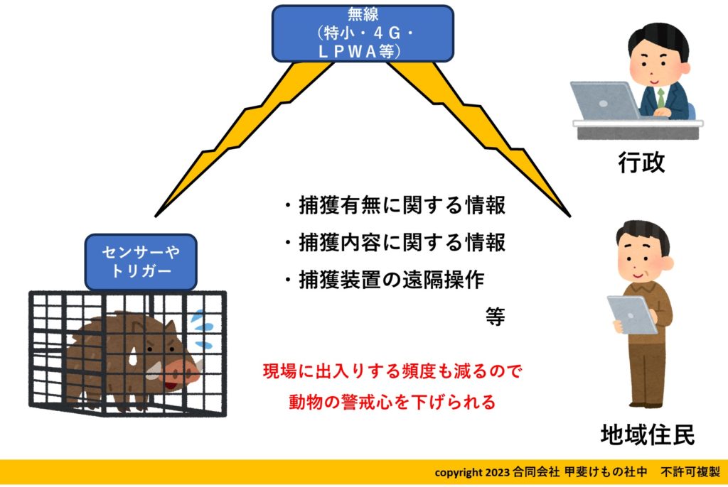 また、PIRセンサー(焦電センサー、自動ドアやセンサーライトに使われる電子部品)を使って、わなの内部の動き(0や1の情報が数秒おきに変動して、捕獲かどうかを知らせる)や、囲いわなの中への侵入個体の数を数えるなどの工夫もあります。