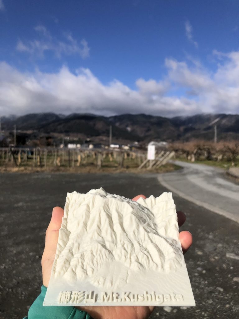 そして、あまりにも櫛形山が素敵すぎて、仕事中や出張先でもいつでも眺められるように仕事の傍ら3Dプリンターで出力してしまう始末。(※注 モデル作成10分程度です。ちゃんと仕事しています。5時間の出力時間の間に1本報告書仕上げています。ちゃんと仕事しています。)